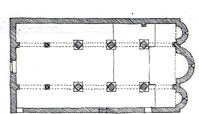 building has a basilical layout with three apses and three naves, each divided from the